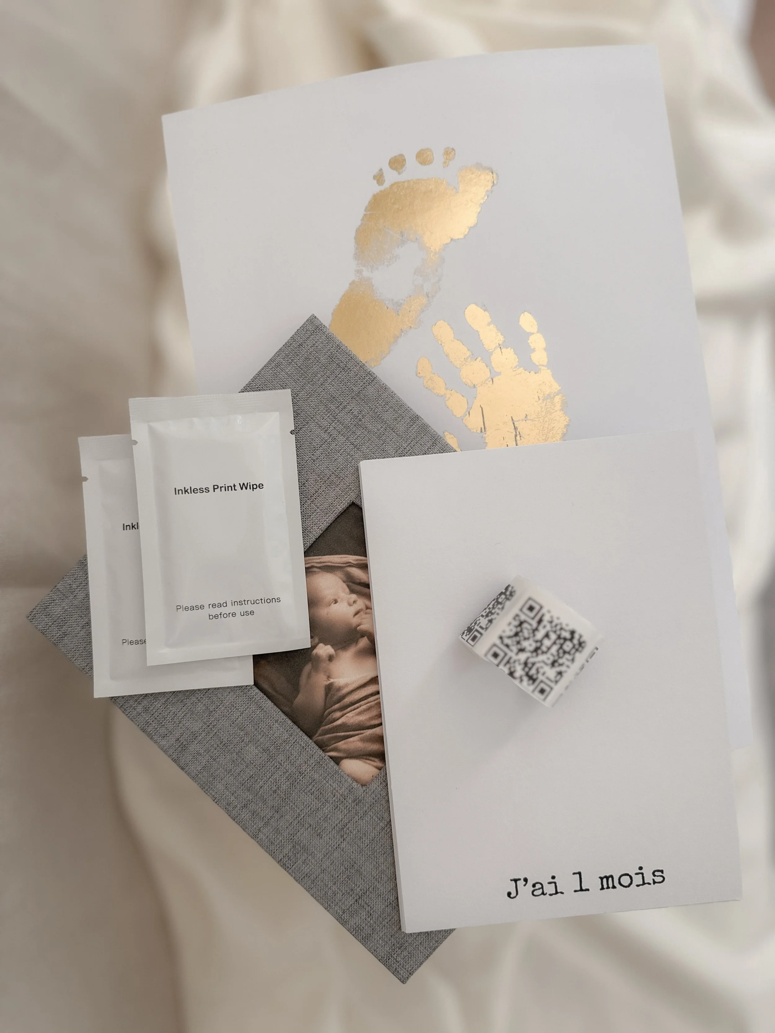 Un coffret complet avec 12 cartes empreintes, 12 QR codes et un album pour documenter chaque mois de la première année.